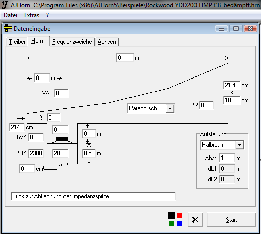 Bei AJHorn 6 kann man eine Abflachung der Impedanzkurve und Verringerung des Pegels um die Resonanzfrequenz erzeugen, in dem man den Abstand zwischen Treiber und per sehr hohem β-Wert (ich nutze meist 1e22) verschlossenen Horn/BR-Kanal nicht auf 0 lässt und mit βVK spielt.