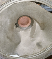 .....wurden die beiden Jabo Hörner durch die Projekte hindurch schon so zurecht gestutzt, dass ich sie wegwerfen wollte. Eine Parkbankbekanntschaft in Berlin mit blauen Fingernägeln brachte mich auf die Idee, die Fragmente zu retten. Das Konzept war schnell geboren Den Mittelton sollte ein JBL Plagiat (Monacor?) übernehmen, ergänzt durch ein Fostex FP50 mit zusätzlichem Horn (zwei Neodym Tabletten halten dieses an Ort), Tiefton bis ca 350/ 400 Hz pumpen vier seitliche 20cm AluBässe von Reckhorn. Diese sind in T.I.C-Manier festgenagelt. Von den acht Befestigungsschrauben sind vier durchgängige Gewindestangen mit dem gegenüber liegenden Chassis verbunden. So werden die Bassschläge annuliert und nicht aufs Gehäuse übertragen.