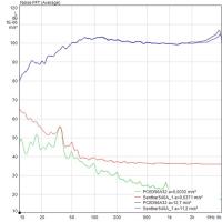 Der Senther in Kombi mit meinem Vorverstärker rauscht etwas mehr als der PCB. Insbesondere unter 20Hz sieht man einen Anstieg des Rauschens. Hier ist allerdings zu beachten, dass das Rauschen schon ansteigt, wenn ich den Verstärker, der den Shaker ansteuert (class AB PA-Endstufe von KMT), anschalte. Von daher bin ich eigentlich ganz guter Dinge, dass das Rauschen kein großes Problem ist, zumal ich bei meiner MFB Realisierung eher so 30-35Hz als untere Grenzfrequenz anstrebe.