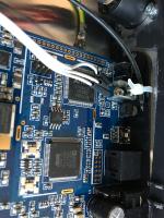 Für die IR FB kommt ein Kunststofflichtleiter zum Einsatz, dessen 1mm Fase genau durch den kleinen Punkt schaut, nachdem ich selbigen vorsichtig nach innen durchbohrt habe. Der Lichtleiter endet über der IR-Diode des miniDSP, die ich ein wenig nach innen gebogen habe. Der Lichtleiter ist schräg angeschnitten, um einen breiten Streukegel zu bekommen. Funktioniert perfekt.