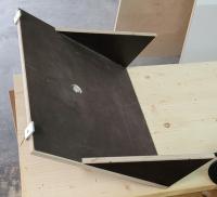 Um den Lautsprecher auf Höhe zu bringen habe ich mir einen Adapter mit TV Zapfen gebaut, sodass ich jedes beliebige Lichtstativ benutzen kann. Zur liegenden Messung habe ich 30° Schrägen angeklebt, zur stehenden Messung passt der Lautsprecher dazwischen. Vorne zwei kleine Metallwinkel, damit der Lautsprecher nicht runter rutscht.