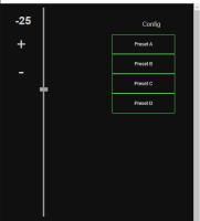 Ganz simpel, mit dem bekannten Schieberegler, +/- Buttons da der Schieber gerade im oberen Bereich doch recht unpräzise zu handhaben ist, numerische Anzeige der aktuellen Einstellung, regelmäßige Aktualisierung der Volume Werte, falls die Lautstärke auch von anderer Seite geändert wird und die 4 Preset Buttons. Umgeschaltet wird mittels eine Buttons auf der bestehenden HTML Seite.