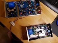 Rauschen und Brummen tut da nix, obwohl der Abstand eng ist. Allerdings hab ich die nach vorne laufende Netzleitung in einen Kupferfolientunnel gelegt, der verlötet ist un an PE liegt. Das ist die NE5432/34 Version unbalanced. Die LED, die ich eingebaut habe, war mir zu hell, daher habe ich ein Stück Lichtleiter eingebaut und erstmal mit Tape befestigt...mal sehen, ob es noch zu hell ist...