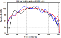 Sodann habe ich auch noch das Original Menhir-Horn MRH83 (schwarz), einen eigenen Tractrix Prototypen aus massivem Beton (blau) und das Celestion 9040P (rot) miteinander verglichen