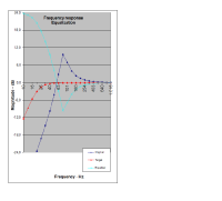 Hier mal ein Beispiel: Das Chassis von Nobby mit F = 80 Hz und Q = 3 auf F=20 Hz und Q = 0,7 entzerrt. Die rote Kurve zeigt den gewünschten F-Gang.