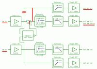 zur Modifikation der Weiche: Das Eingangssignal L/R wird im Addierer U3 zum Monosignal. Dieser speist bereits den linken SUB-Kanal. Trenne den linken Hochpass auf und verbinde in ebenfalls mit dem Addierer-Ausgang. zur Spannungsversorgung: Die Schaltung braucht eine Doppelspannung - also +/- 6...15VDC Wenn 24VDC vorhanden, kannst Du daraus +/- 12VDC mit ca. 100mA machen. ;-) Detlef