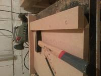 3. Man benötigt bei 22mm MDF schon einen 25mm Bündigräser (mit Anlaufring) Die vorher mit der Stichsäge zurechtgeschnittene Schablone wird auf die Bodenplatte geschraubt.