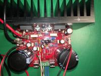 Nach den Festtagen habe ich mich wieder an die Arbeit gemacht und die M3 Gewinde in die Kühlkörper geschnitten (18 Stück insgesamt). Dann habe ich die restlichen Komponenten auf die Platine gelötet und wurde heute damit fertig. Ich muss sagen, ich bin schon fast ein wenig euphorisch, denn nach dem ersten Einschalten ist noch nichts kaputt und ich messe um 9.9 mA am Lautsprecherausgang + und - bei kurzgeschlossenem Signaleingang. C1 habe ich dabei weggelassen, ich vermute, dass der bei dieser Messung keine Rolle spielt. Wie von "Kondensator" vorgeschlagen, werde ich ihn ausserhalb der Platine verbauen, weil er so gross ist.