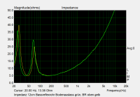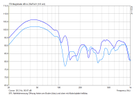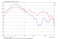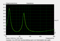 Aber ich kann dich beruhigen: die Theorie passt schon. Dazu mal schnell der Vergleich der Impedanzgänge bei Bodenaufstellung und wenn das BR-Rohr nach oben zeigt: