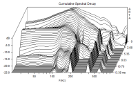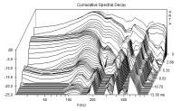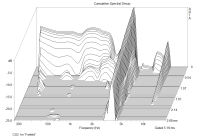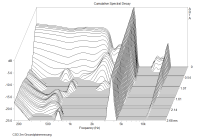 Wie gesagt, die Response des Lautsprechers ist der Bereich innerhalb der ersten paar Perioden. Resonanzen sind das, was schmalbandig direkt "davon ausstrahlt". Hier noch ein deutlicheres Beispiel dafür, wie ungefilterte / unbedämpfte Gehäuseresonanzen aussehen können/sollen: