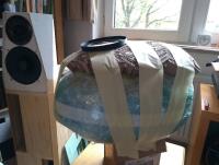 BR-Rohre werden aus leeren Montagekleberkartuschen, zunächst auf 8cm Länge, eingearbetet - bevor Beton auf das Ei kommt.