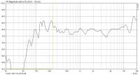 Ich finde, man sieht, dass die Überhöhung eigentlich durch Raumreflektionen zustande kommt. Das zeigt ja auch der gelbe Balken am unteren Rand an. Der besagt ja, dass die Messung in diesem Bereich nicht aussagekräftig ist, weil man eben den Raum misst und nicht den Lautsprecher. Ich habe einmal den Cursor gesetzt ab welcher Frequenz man überhaupt etwas entnehmen kann. Ich würde sogar noch höher gehen. Ab ca. 500 Hz sieht man etwas Nachvollziehbares.