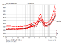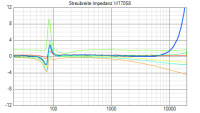 [ATTACH=CONFIG]45549[/ATTACH] [ATTACH=CONFIG]45550[/ATTACH] Beim W170S8 sind ähnliche Streuungen wie beim FRS8 zu verzeichnen. [ATTACH=CONFIG]45551[/ATTACH] Die Simulation mit einem 12 dB Tiefpass zeigt zwischen den beiden Impedanz-Extremen 2-2,5 dB Unterschied. Gruß Heinrich