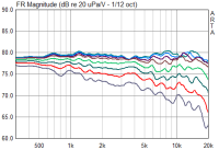 - Die leichte Überhöhung unter Winkel bei 3-4 kHz ist etwas unterschiedlich --> ist ggf. 1) durch das "frei nach Schnautze" verdrehen und 2) durch Unterschiede bei den händisch geschliffenen Radien an den Schallwandkanten erklärbar (ist wahrscheinlich der Haupteinfluss - fällt optisch nicht groß auf, aber wenn man beide LS mal übereinanderstellt und von oben schaut sind das schon Abweichungen bei den Radien im Millimeterbereich)