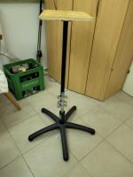 Sitzfläche abmontiert. Gasdruckzylinder mit einem 70 cm Tischbein von Hornbach verlängert und Platte oben drauf geschraubt. Zum Schluss noch einen Zeiger dran. Kabelbinder sind meine Freunde.