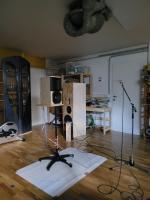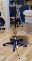 Ich nutze ein altes Fotostativ (Dreibein) mit Höhenverstellung mittels Kurbel, oben am Kopf ist der Galgen für das Mik montiert.