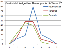 Je mehr Tonalität und Räumlichkeit "wichtig" sind, desto weniger Wert wird auf "Dynamik" gelegt - in der Grafik gibt es in Richtung "oben" und "recht" eine Zunahme an grünen und blauen Punkten.