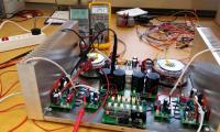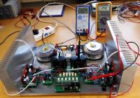 ich habe eine der zwei Verstärkerplatinen nun endlich mal an das dazugehörige Netzteil gestöpselt. Wider Erwarten hat alles problemlos funktioniert beim Einschalten. Den Ruhestrom habe ich über den Spannungsabfall zwischen den beiden Emittern der Ausgangstransistoren eingestellt. Er soll laut Dokumentation 24 mV betragen.
