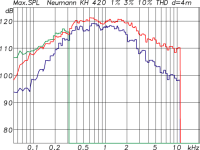 Udo schrieb:in der Bild-Überschrift (als Text) steht " Maximalpegel in 1 m (Grün: 10% THD, Rot: 3% THD, Blau: 1% THD) "