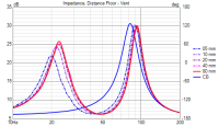 Meines Erachtens bewegt man sich bei Downfire zwischen den Extremen CB (Box steht auf dem Boden) und VB (normale Bassreflexbox, freistehend). Das finde ich durch meine Messungen auch bestätigt und ist sehr schön bei den Impedanzmessungen zu sehen. Bereits bei 5 mm Bodenabstand ist die Bassreflexwirkung zu sehen, wie erwartet durch Kopplung der im Spalt befindlichen Luftmasse tiefer abgestimmt, aber mit höhere Verlusten (leider habe ich keine 2,5 mm Messung gemacht). Bei meinem Versuch ist bereits bei 20 mm Bodenabstand kaum noch ein Unterschied zur unbeeinflussten Bassreflexmessung zu sehen.