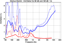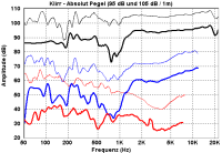 Hier noch einmal die Klirrverläufe. Bei der 95 dB Messung stand das Mikrofon 20 cm vor dem Lautsprecher. Bei der 105 dB Messung stand das Mikrofon 100 cm vor dem Lautsprecher.