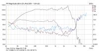 Der Klirr ist insgesamt geringer. K3 ist aber wieder oberhalb von K2 und steigt schneller an. Das war bei den Messungen der Endstufen auch so. Verglichen mit der ersten Messung (draußen) sieht K3 bei der jetzigen Messung (drinnen) aber deutlich sinnvoller aus.