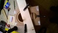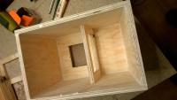In einer Hauruckaktion habe ich dann an Silvester den Rohbau der Boxen zusammengebaut (siehe Bilder). Mit Variera haben sie aber nur noch die gleichen Schallwandabmessungen und die leichte Neigung nach hinten gemeinsam. Alle anderen Winkel habe ich zugunsten eines einfachen Zusammenbaus geopfert (außerdem wäre das Volumen sonst nicht ausreichend groß geworden). Weiterhin ist die Box deutlich teifer als Variera. Neue Tiefe innen: 18 cm. Damit ist das Innenvolumen ist nun 6.21 Liter. Material ist 10er Kiefer-Multiplex.