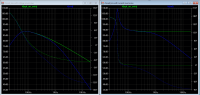 Links der LS an einer Spannungsquelle, rechts an einer Stromquelle. Die grünen Kurven zeigen die Schalldruckpegel-FG, die blauen die Schallleistungspegel-FG.