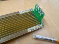 Dann wieder satt Brühe aufsprühen und ein Stück Kapton-Klebeband auflegen, klebende Seite zum Metall. Man kann das Kapton auf dem Wasserfilm dann noch etwas ausrichten. Dann die Oberseite einsprühen (dient als Schmiermittel) und die Brühe wieder rausrakeln.Es erfordert etwas Übung, bis man es komplett Blasenfrei hinbekommt. Aber wer schonmal Folien auf Autoscheiben aufgebracht hat...
