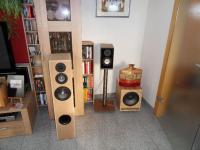 Zuerst: Ich konnte bisher nur in meinem Wohnzimmer hören, d.h. wegen der lieben Nachbarschaft und dem hellhörigen Altbau nur mit sehr gemäßigten Pegeln. Das Wohnzimmer ist oben mit großen Lochplatten-Eckabsorbern ausgestattet, die Wände sind voller Bücherregale und überall wo man es nicht sehen kann sind Basotectplatten angebracht (Rück- und Unterseite der Schränke, Unter dem Sofa etc). Akustisch mMn nicht ganz übel. Optisch aber nix für Freunde ordentlicher und spärlich "bemöbelter" Räume.