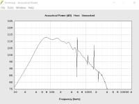 - Ich war mit unbedämpfter Rückkammer keineswegs unzufrieden mit dem Midbass - die Messungen zeigten nur eine kleine Resonanz bei 300Hz, die allerdings bei den Originalmessungen von Beyma von dem verwendeten Chassis auch zu sehen sind. Der Wirkungsgrad is bei 600Hz ca 6db geringer als im Maximum von ca 80..100Hz - die Grenzfrequenz des Horns liegt bei 50Hz...