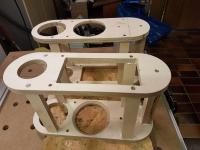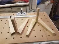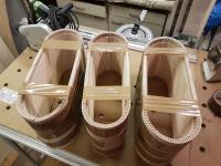 Aufgedoppelte Fronten und Rückseiten mit V-Fase ermöglichen das Verleimen, so das am Ende alle Fugen und Stöße verdeckt sind. In meinem Beispiel bleibt als einzige Stoßfuge die Mitte der unteren Rundung, die dann durch den Fuß komplett verdeckt wird. Ablauf in Schnelldurchlauf siehe Fotos.
