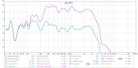 Nach 10 gemittelten Messungen rund um den Hörplatz (violett) habe ich noch einmal den Bereich bis 600 Hz im Input-EQ des MiniDSP HD angepasst und das Resultat (petrol) ebenfalls nochmal durch 10 gemittelte Einzelmessungen verifiziert: