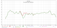 Ich habe dann den Breitbänder auf Achse in 1m Abstand gemessen. Rot ist unbeschaltet, grün ist mit Hochpass und kleinen Korrekturen im unteren Bereich: