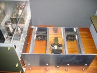 Daneben - falls die Frage aufkommen sollte - steht meine "große single ended" (EL156 +Ub 350V, Ug2 250V, Ia 120mA, Ra 4K ). Gleiches Gehäusebauprinzip - allerdings noch nicht mit eingeschobenen Gewindemuffen/Langmuttern, sondern mit durchgehenden Gewindestangen. Das machte dann die Messinghutmuttern auf der Frontplatte erforderlich ............