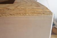 Hier im Beispiel hatte ich oben auf das Gehäuse ein 4mm Sperrholzbrett (Pappel) geklebt, damit man die Stöße nicht sieht. Dafür sieht man jetzt die Spur des Fräsers