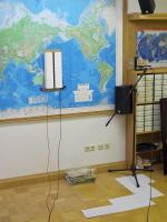 Oder ich stelle das LA auf einen großen Schreibtisch, in der Hoffnung, dass eine Spiegelwelle z.B. ab 680Hz erzeugt wird, weil die Wellenlänge 0,5m und der Schreibtisch tiefer ist. Die Rechnung sieht dann so aus: f=680Hz, h=0,8m, hspiegel=1,6m -> d=2,56m. Das würde dann passen.