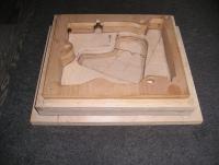 Gaanz einfach: Schicht für Schicht ab der Trägerplatte des Chassis nach unten..............einfach das Innenprofil der Trägerplatte auf die nächste Platte übertragen und mit der Stichsäge aussägen. Achtung ! Im Randbereich des Federtopfs nach unten zum danebenliegenden Antriebsmotor muss der Ausschnit etwa 1/2 cm nach aussen erweitert werden, damit der Motor genügend Freiraum hat