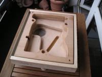 Der Sockel ist soweit fertig (muss noch geschliffen werden) und besteht aus 3 in Form gesägten 24mm starken Multiplexplatten - wovon die unterste nur noch rudimentär vorhanden ist, sie bildet den Motortopf (mit eingelegtem Belüftungsgitter).