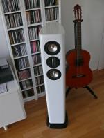 Das Design muß zur Einrichtung passen. Kühlschrank große Schallwandler kommen nicht in Betracht. Schuhkarton große Böxchen erfüllen nicht die klanglichen Anforderungen. Also eine Standbox mit weißem Seidenhochglanzlack. Nicht zu groß und mit einem augenfreund­lichem Erscheinungsbild sowie mit einem Hauch von klassisch-elegantem Chic.