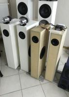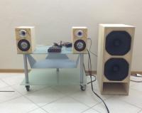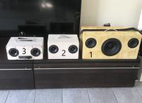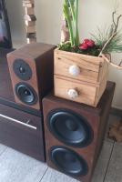 ich habe einiges gerade in der Entstehungsphase: das 2.1 System aus 10 cm Breitbänder (B100) und 19 mm Kalotte (G20SC) plus 200 mm Doppelsub (TIW200) wird auch gesteuert über eine umgebaute Behringer, zweites Bild; Behringer ganz oben, Wohnraumfreundlich umgebaut. (die Schubladen, oben auf sind Prototypen für eine Vitrine aus Recyclingholz.)