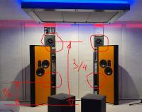 Derzeit laufen 4 Stück jeweils in Nähe der Satelliten im Stereobetrieb bis 120Hz. Die Satelliten haben jeweils zwei 8“er als Tieftöner.