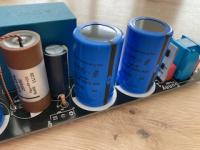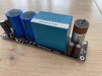 Das klappte recht gut, war natürlich sehr aufwändig vom Ladevorgang her betrachtet. Klanglich haben wir damit allerdings nicht das gefunden, was wir uns erhofft hatten. Nach dem Abschalten der Netzspannung wurde der Klang von Minute zu Minute langweiler. Bessern konnten wir es, indem wir zusätzlich ein kleines Low-Noise-Netzteil hinzu geschaltet hatten. Damit konnte die Spannung gehalten werden, was dem Klang gut tat. Später haben wir ausgangsseitig zusätzlich Polymer Kondensatoren gesetzt und im nächsten Schritt einen ausgangsseitigen Regler und weitere reguläre Kapazitäten.