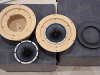 Der KEF-Koax hat nun ein Gehäuse erhalten. Die Erstellung ist gar nicht mal so einfach, da recht präzise Mehrfachpassungen nötig sind. Ferner ist der Magnet genau so groß wie der erforderliche Lochausschnitt. Kabelführung fummelig, exakte Zentrierung nötig wegen des Shadow Flares und die Tiefenmaße müssen natürlich auch exakt passen. Wer das Chassis mit dem optionalen Montagering montieren will, sollte eine abnehmbare Rückwand vorhalten. Da das Chassis 15mm vertieft sitzen muss, ist zudem entweder eine Schallwandstärke von 28mm erforderlich oder eben die Verwendung des Montagerings.