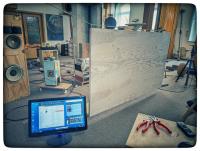 Im Zyklus "Grenzen meiner Bastelwut ausloten" widme ich mich noch einmal meiner Schallwand. 3mm Sperrholz mit Rahmen. War ursprünglich als Ersatz eines Vorhanges gedacht. Angeschraubt sind zwei Monacor Exiter. An den Befestigungsschrauben auf der Zuhörerseite sind Schildpatt Scheiben aufgeleimt (HT?) Das Duvet bedämpft den rückseitigen Schall. Ohne dieses scheint das Musikgeschehen weit hinter dem Brett stattzufinden. So klingt es auch. Aber mit etwas tweaking und ziehen am Kuhschwanz gelingt ein erstaunliches Klanggeschehen. Es hilft auch hier ein separater Bass. https://photos.app.goo.gl/bbhDpcvV9h8deyM16