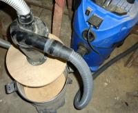 Den letzten Metalleimer habe ich mit einem sauber gefrästen Deckel versehen und einen Zyklon aufgeschraubt. Das funktioniert prächtig, auch der Feinsstaub vom Schleifen gelangt kaum noch in den Staubsauger.