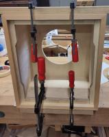 Heute habe ich zunächst die Montagerahmen der Passivmembranen fertig gemacht und mit den Rückwänden verschraubt, anschließend am Zylinderschleifer die Ausschnitte nochmal nachgearbeitet, so dass die auch Deckungsgleich sind. Der Kreisschneider hinterläst auch eh nicht die schönste Oberfläche, von daher war da etwas Schleifen eh nötig.