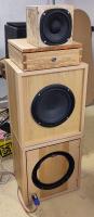 Oben drauf steht der Entwicklungsprototyp für die Satelliten zu den Subs. Die Gehäuse sind noch zu klein, ich werde da noch experimentell eine gute Schallwandgeometrie ermitteln, und dann passende Gehäuse in hübsch bauen. Das ist jetzt ein (mittlerweile zwei) Würfel mit 15 cm Kantenlänge außen und 15 mm Wandstärke. Chassis ist ein Celestion TFX0515.
