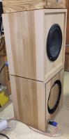 Hier sind drei Gehäuse fertig furniert und geschliffen, fehlt noch die letzte Ölung. Davon wie ich die Abschnitte zu Kantenumleimern gemacht habe und schön auf Gehrung da drauf gefummelt habe habe ich keine Bilder mehr gemacht, das war auch so schon genug Arbeit. Im Nachhinein betrachtet wäre es wahrscheinlich wenn auch nicht günstiger so zumindest deutlich schneller gewesen, die Gehäuse aus Massivholz zu bauen. Dann hätte man allerdings nie so ein gleichmäßiges Maserungsbild über alle 4 Subs bekommen.