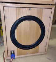 Ich habe diesmal auf einen Prototypenbau verzichtet und gleich alle 4 Subwoofer zugeschnitten, nur nach Simulation. Nachdem das ja beim letzten mal so hervorragend funktioniert hatte. Naja, als ich den Stapel Zuschnitte so vor mir liegen sah und schon alle Lamellos eingefräst hatte, die Passivmembranen auch schon soweit vorbereitet waren meldeten sich doch Zweifel an der Konstruktion. Also habe ich erst einmal einen Sub verleimt und eine Passivmembran fertig gefrickelt und das ganze ausprobiert. Ich dachte mir so: Vorm verleimen kann man ggf. nötige Änderungen noch einfacher implementieren. Wobei das nach dem Zuschnitt auch nur noch so leidlich geht. Naja. Muss ich jetzt durch. Ein guter Freund sagt immer: Auch Holzwege müssen zu Ende gegangen werden! Also los. Ich baue also einen Sub so fertig wie geplant, inklusive aller dekorativen Features. Da das ganze ja nicht für mich wird, wollte ich mir da an der optischen Front ganz besonders viel Mühe machen, also die Multiplexkanten in der Passivmembran erstmal überfurniert: